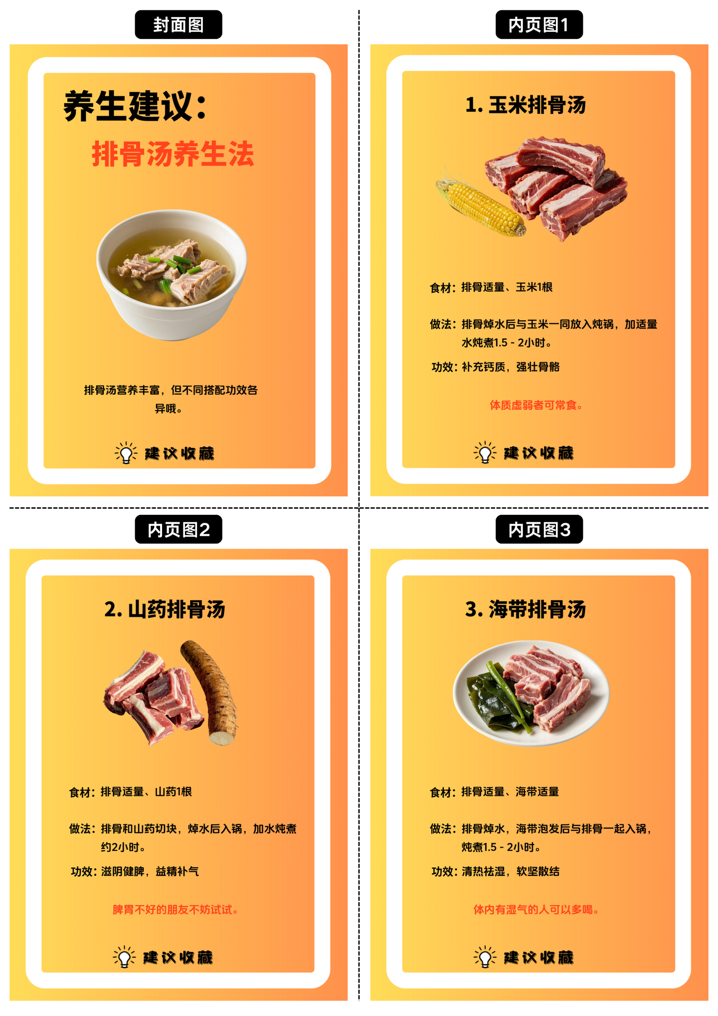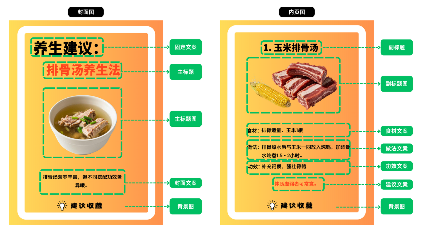 这类养生食谱的图片包含一张封面图和多张内页图,且封面图和内页图的排版不统一,所以需要把2个图片的结构都拆解出来,工作流也需要生成一张封面图和多张内页图
