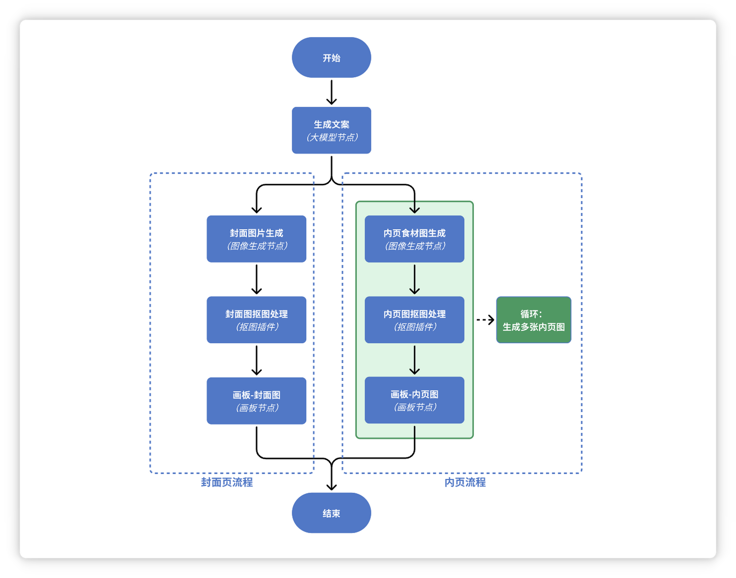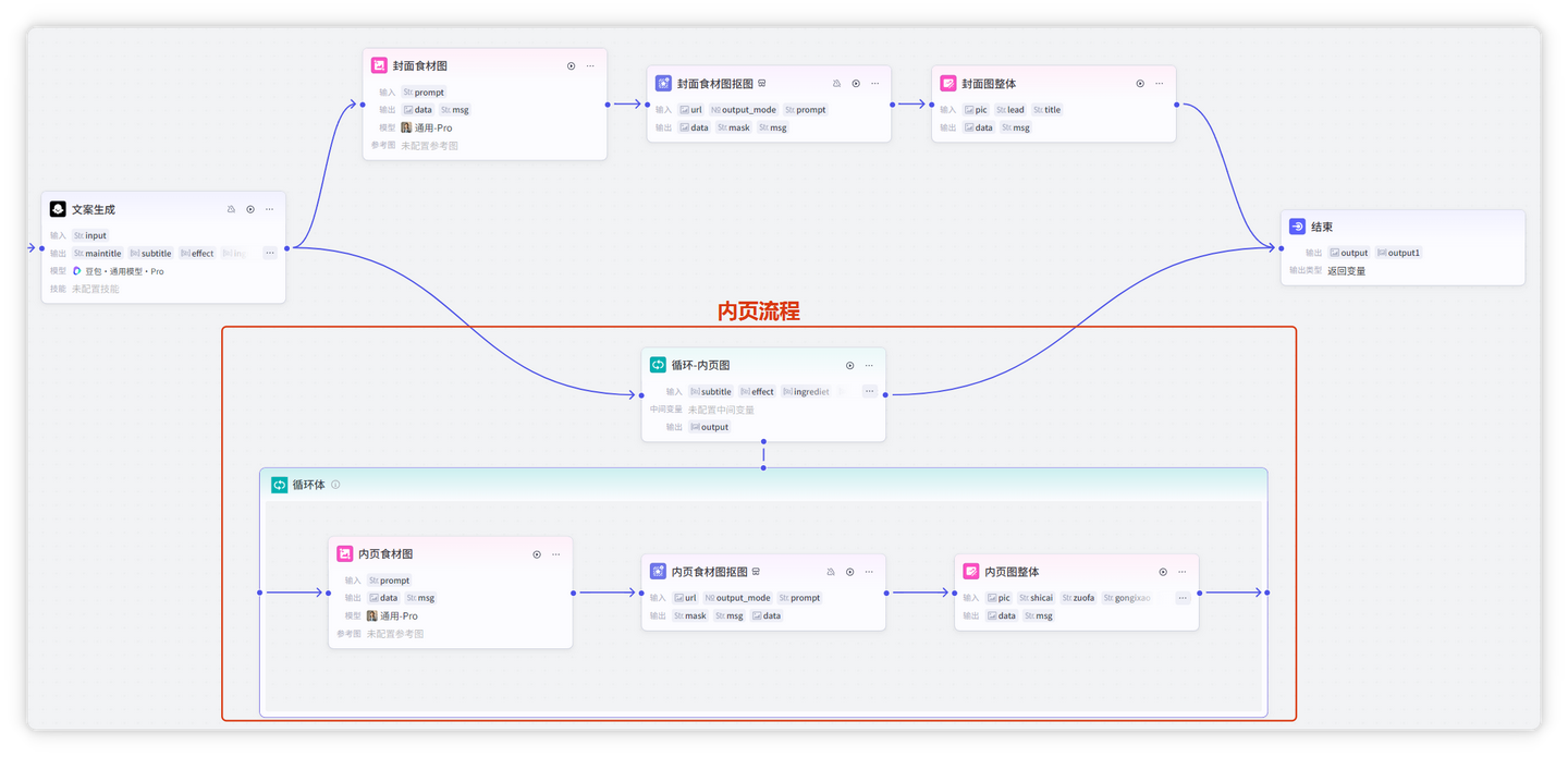右边的流程(内页图生成)使用了循环,是因为需要生成多张内页图,从而使用循环的流程,而封面图只需要一张,所以直接输出就可以