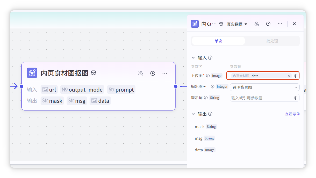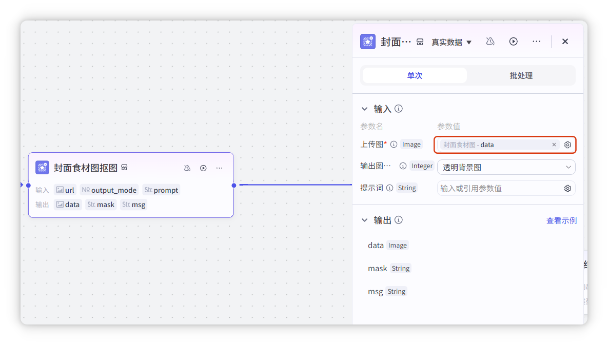 - 输入:上传图选择封面食材图片生成节点输出的图片,输出图选择透明背景图即可;主要目的是处理生成的封面食材图片,保持统一透明背景