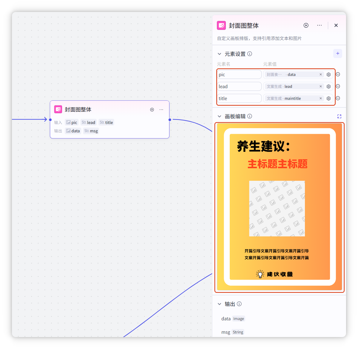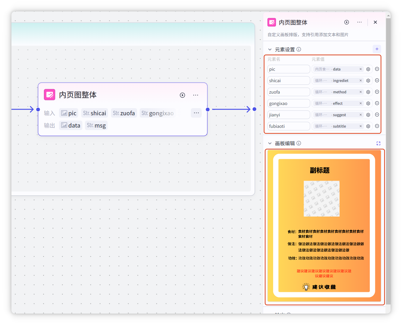 - 元素设置:添加文案生成节点中输出的副标题、食材、做法、功效等文案和内页食材图生成的图片