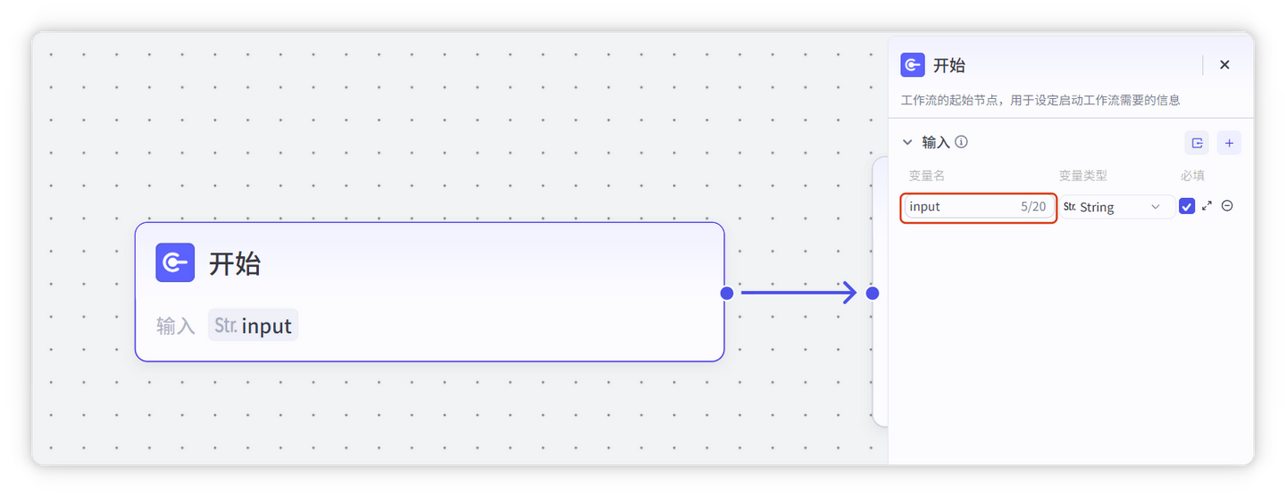 - 输入:输入参数名即可;变量值:选择开始节点的参数input(开始节点输入后会直接传到这里)