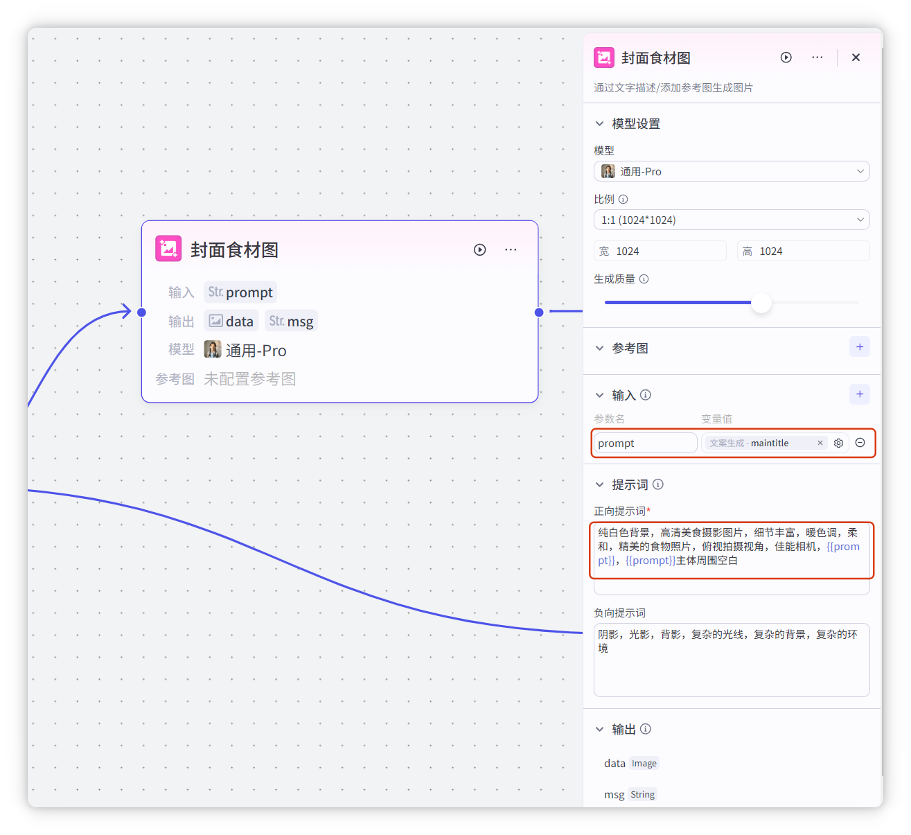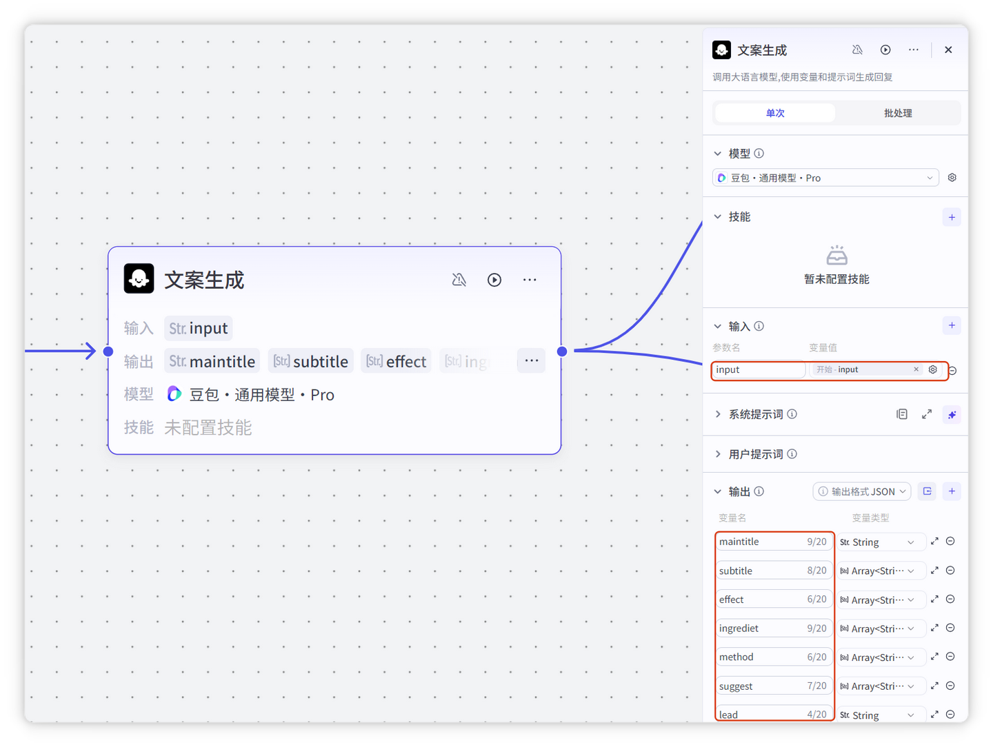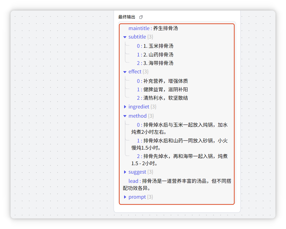 - 输出:这里输出8个变量:主标题、封面文案、副标题、食材、做法、功效、建议文案、提示词;