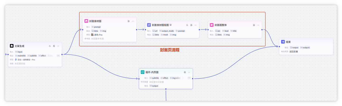 这里需要重点注意一下,在第二步生成文案大模型节点之后,出现了两个流程(封面页流程和内页流程)