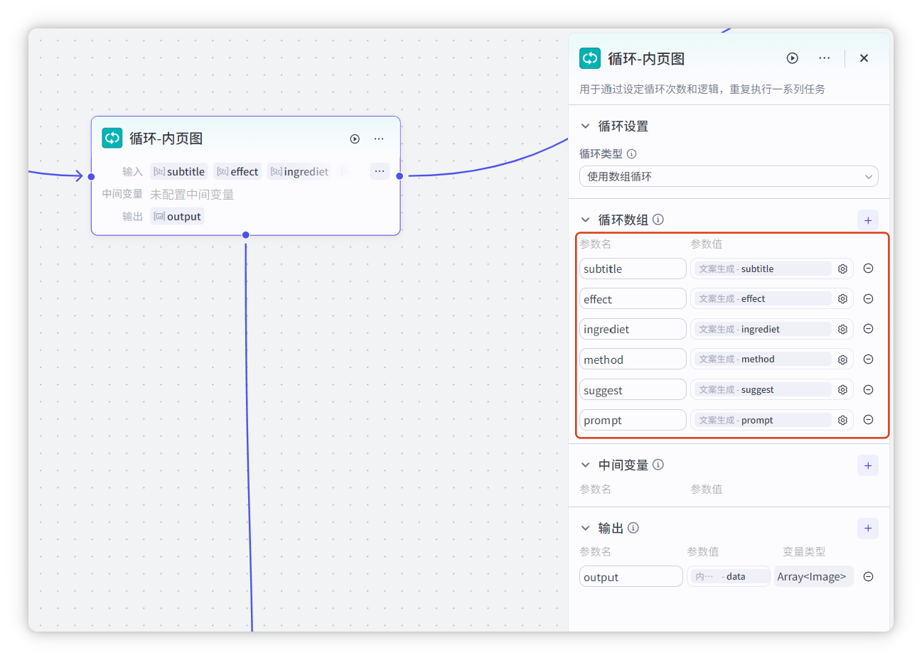 - 循环数组:这里的参数值引用文案生成大模型节点中内页相关的所有参数(副标题、食材、做法、功效、建议文案和副标题图提示词)