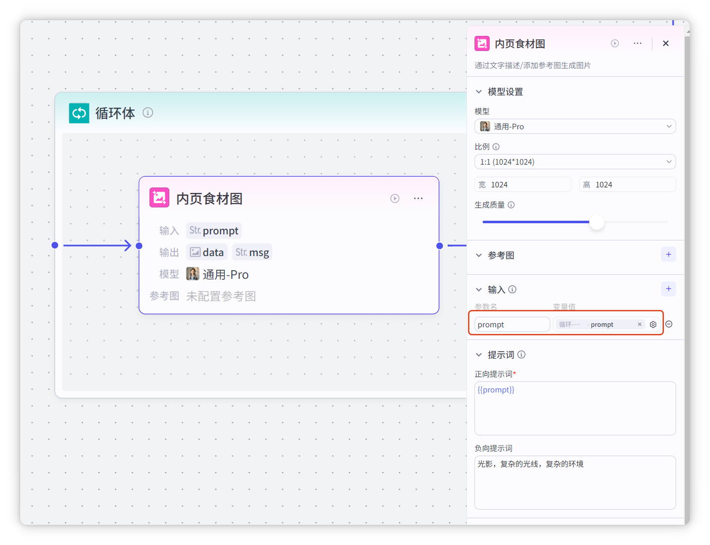 - 文案生成节点中,生成了多条内页所需要的文案、提示词,所以在循环体中使用每组文案生成一张内页,从而实现批量制作内页图