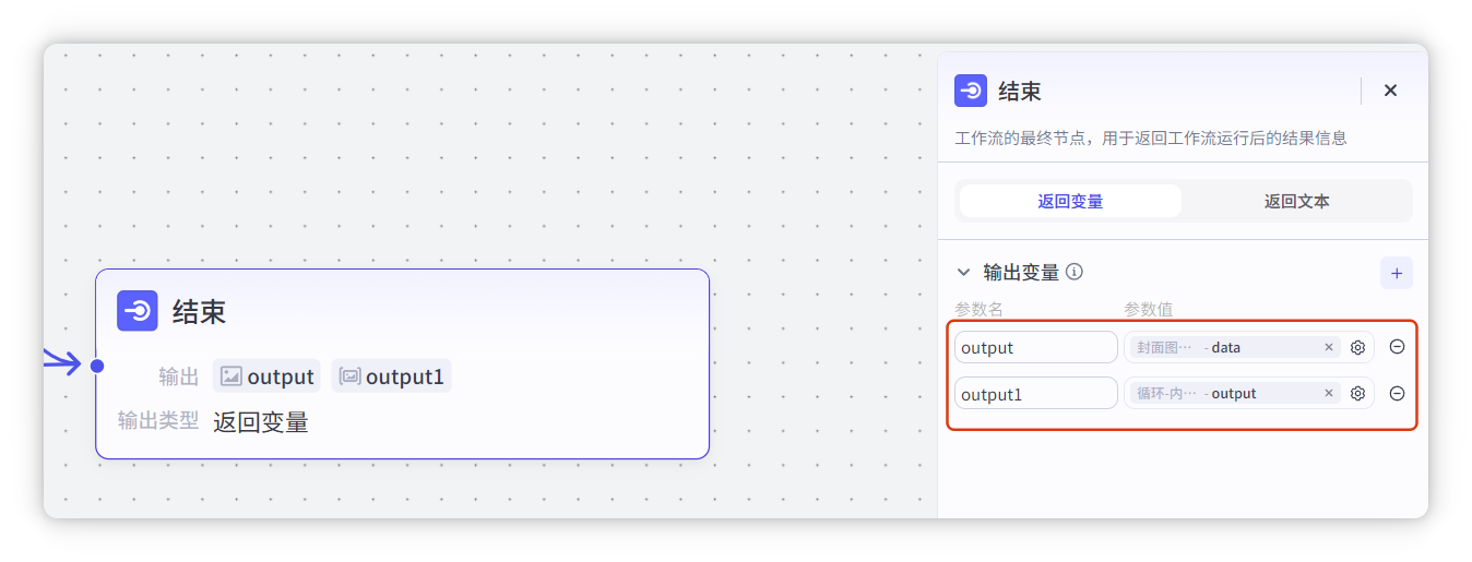 - 输出变量:由于工作流使用了2个流程出图,所以这里输出节点添加两个参数值,一个是封面图画板中输出的图片,另一个是循环节点输出的内页图