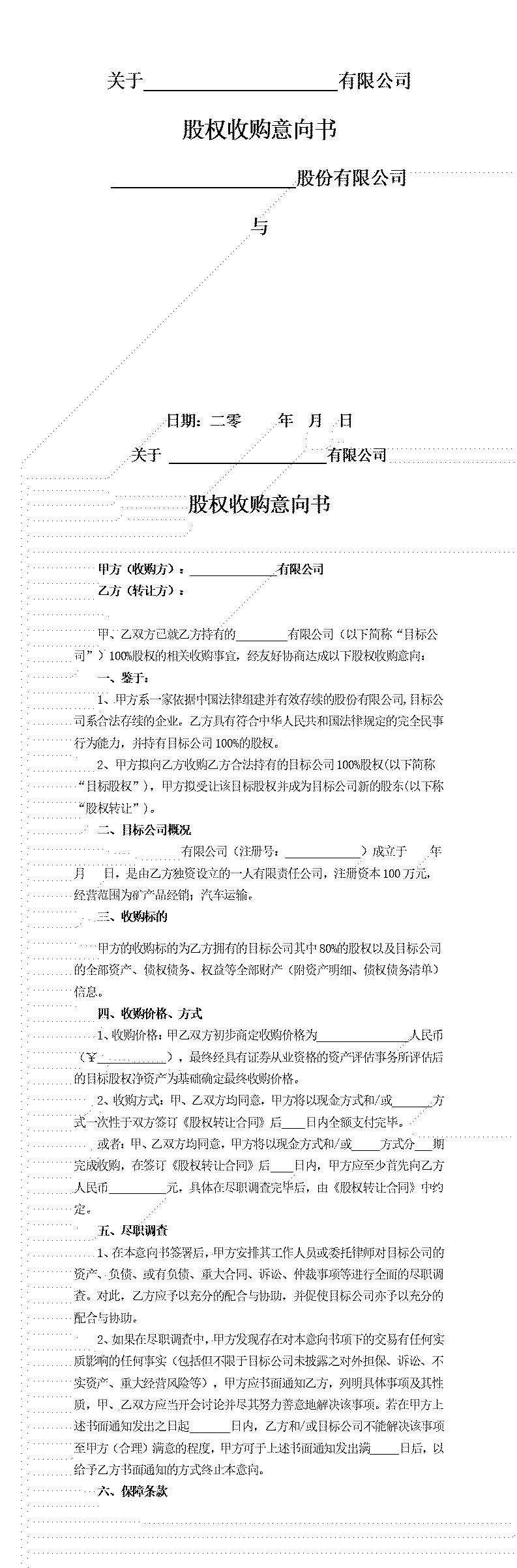 20xx股权收购意向书